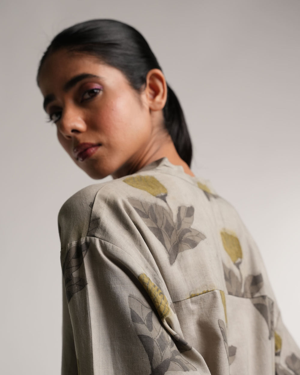 Ethically crafted Ajrakh Co-Ord Set in Beige, featuring handblock floral prints, organic plant-based dyes, soft cotton fabric, and a regular fit—perfect for work and daily wear.