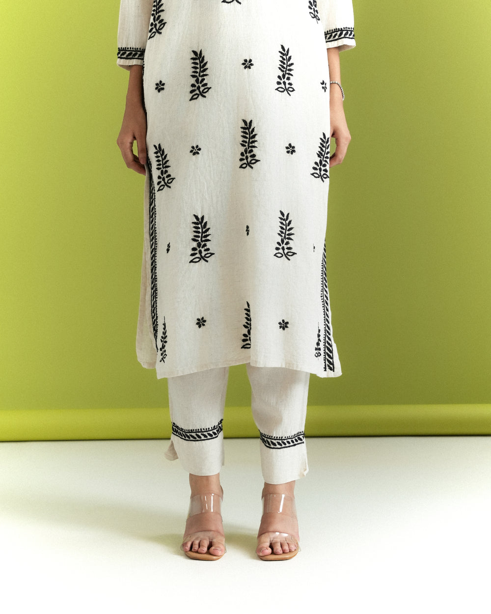 Off-white linen-cotton with bold black chikankari details. Front black buttons, round neck, and 3/4 sleeves make this a statement of effortless sophistication. Pair it with minimal accessories, and let the kurta speak for itself. Hand wash.