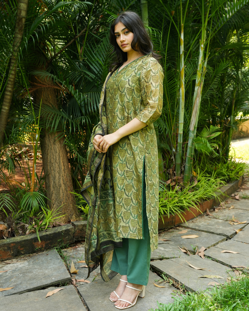 Step into sustainable style with our green organic Tulips hand-block printed Maheshwari Silk Kurtha. Embrace the beauty of Indian ethical wear for women, where tradition meets eco-chic. Elevate your wardrobe with this timeless piece. Shop now for a unique blend of elegance and sustainability.