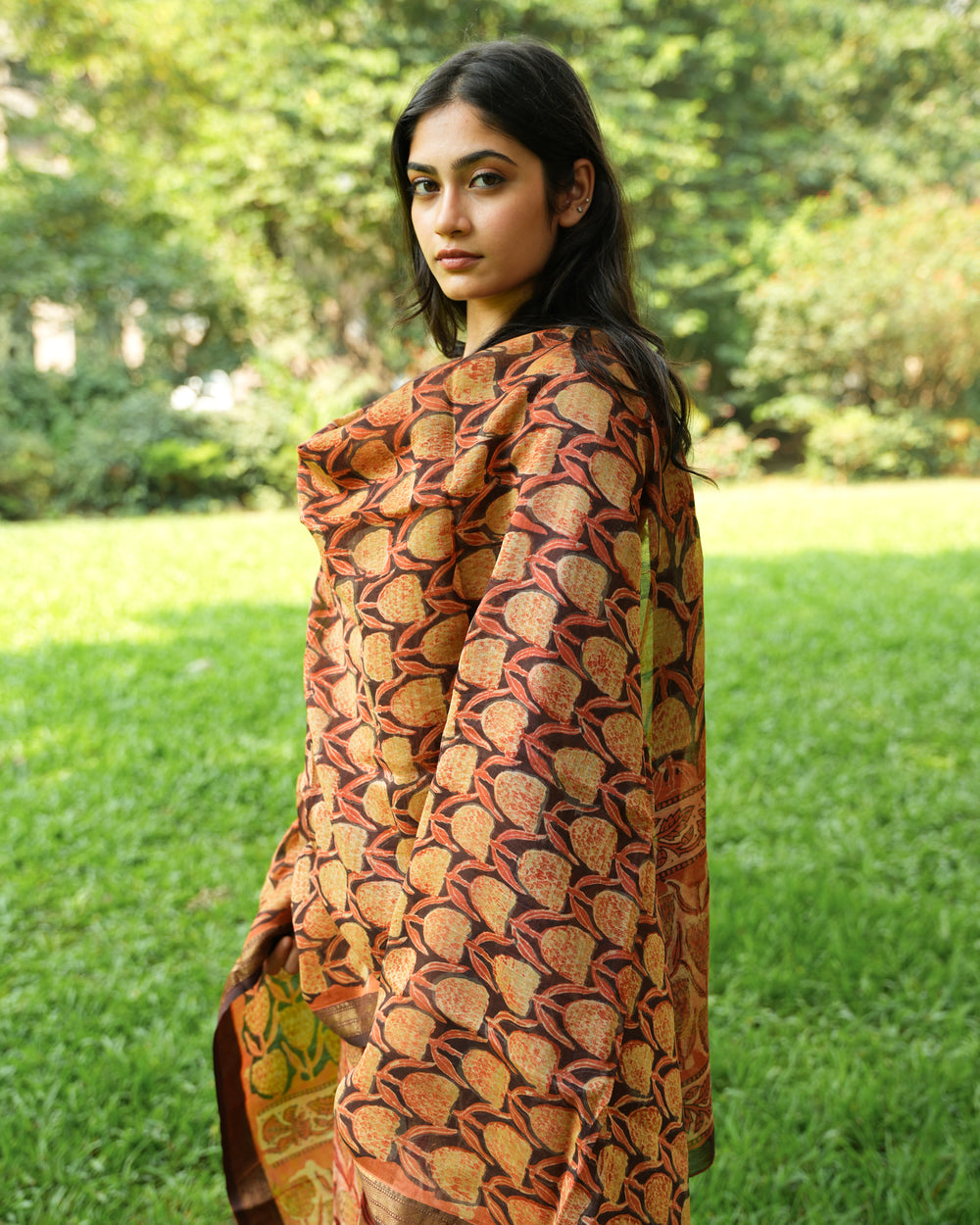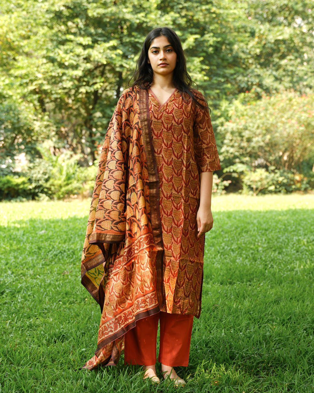 This Orange Tulips Kurta Set features a beautiful hand-blocked plant-based print on Maheshwori organic silk. The kurta set comes with a pocket for added convenience and is complemented by a Maheswari silk dupatta. The bottom is made from breathable cotton, offering ultimate comfort.