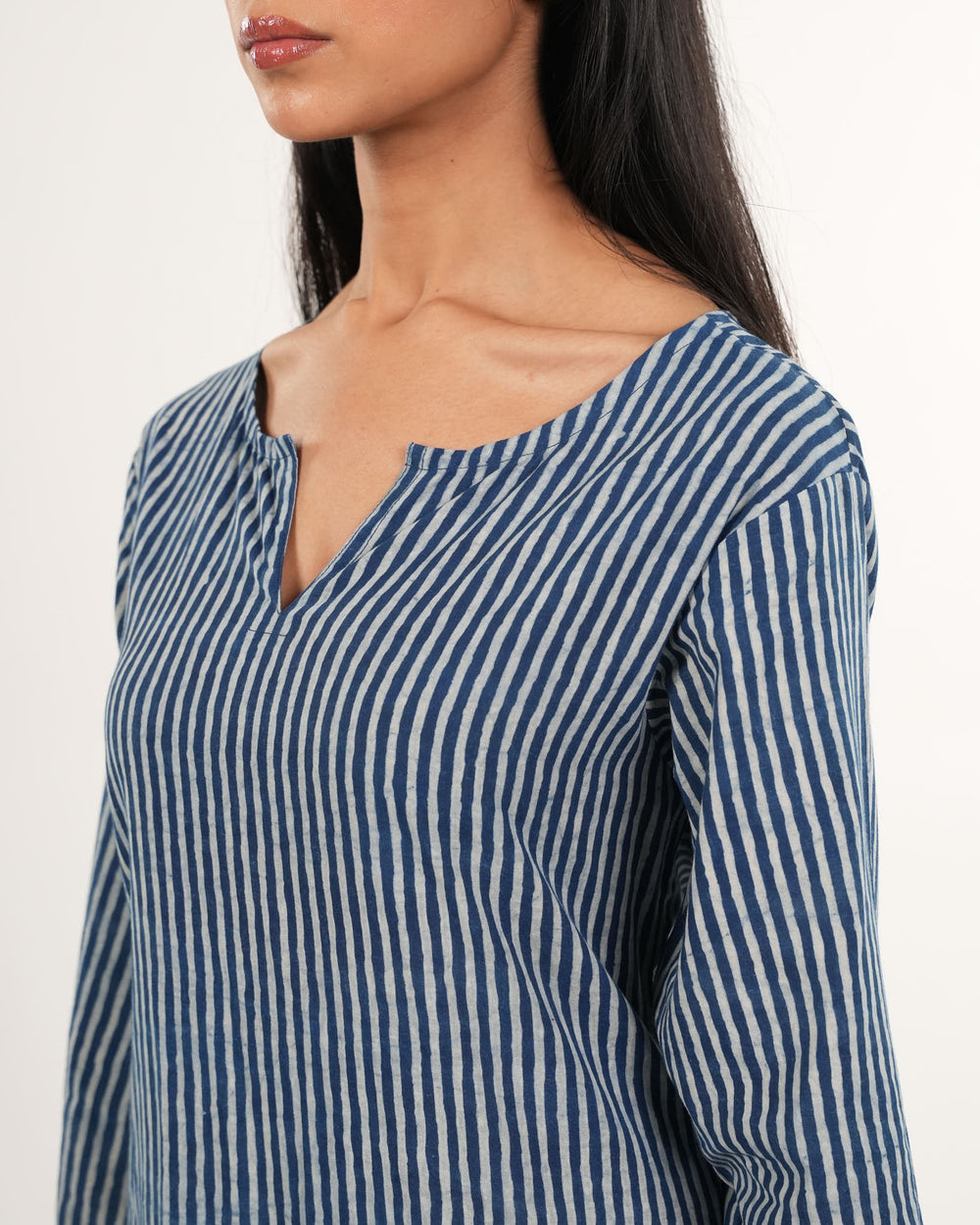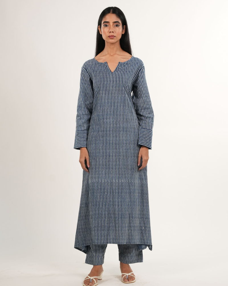 Indigo Striped Kurta Set with Sleeves | Handblock Printed | Neelmii