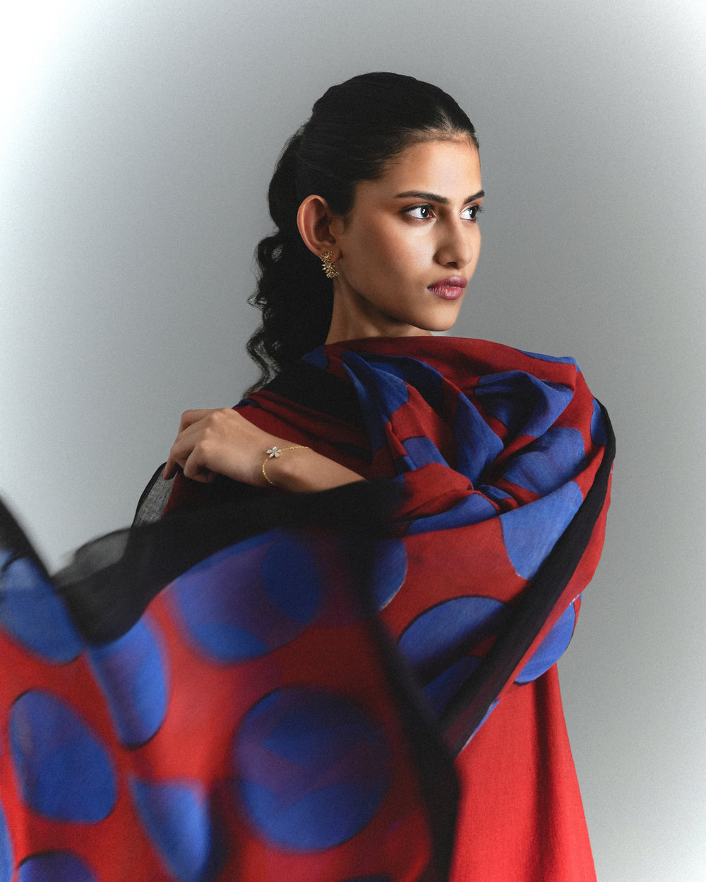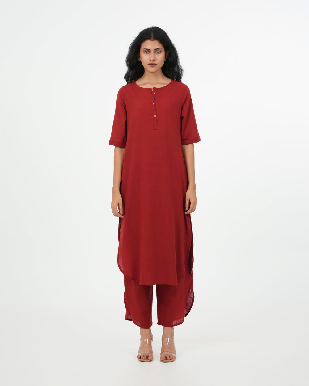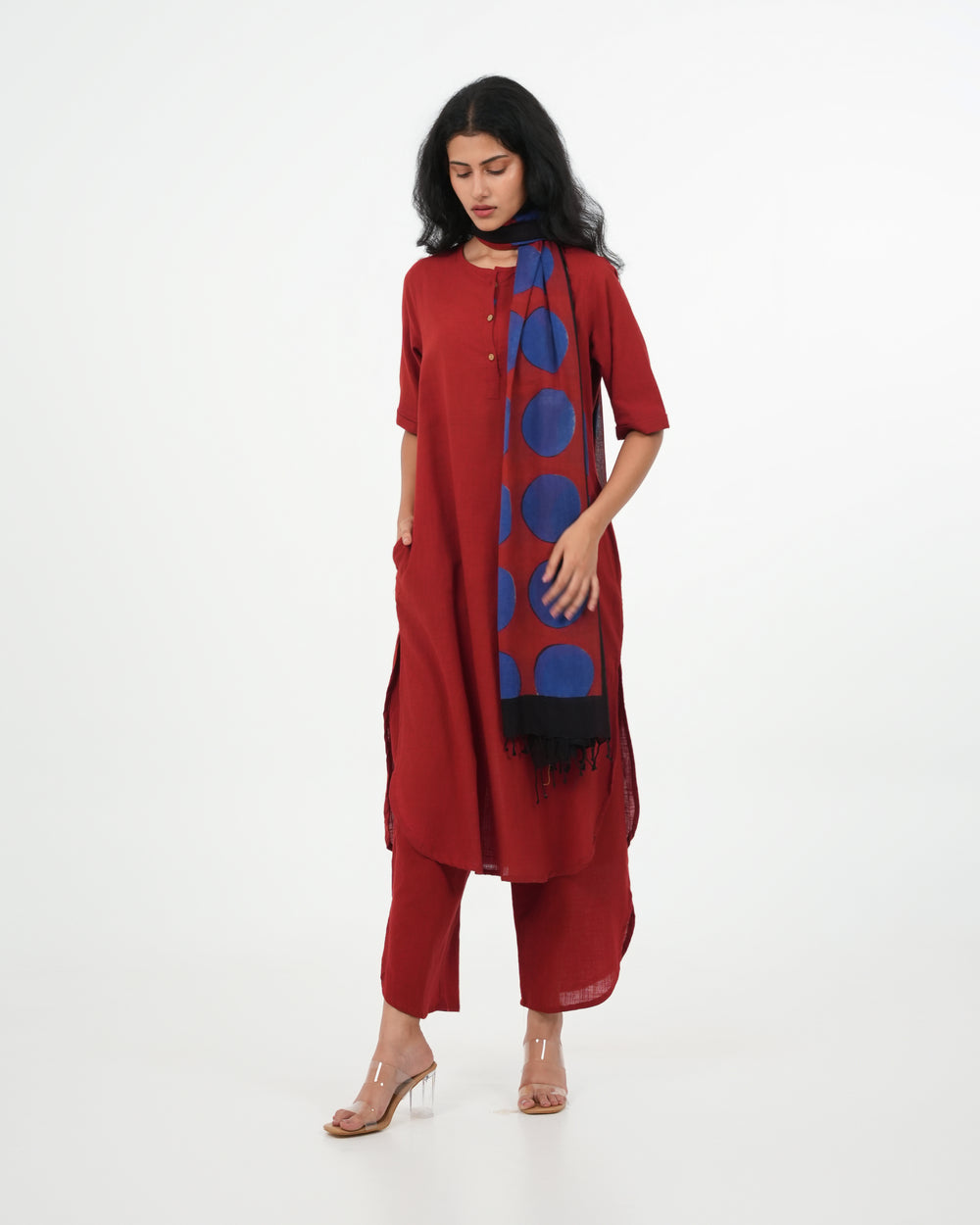 This maroon cotton kurta (plant-based dye) comes with 3/4 sleeves and a blue polka dot dupatta in handloom mulmul cotton fabric with hand block Bagru print—an ideal combo for casual sophistication.