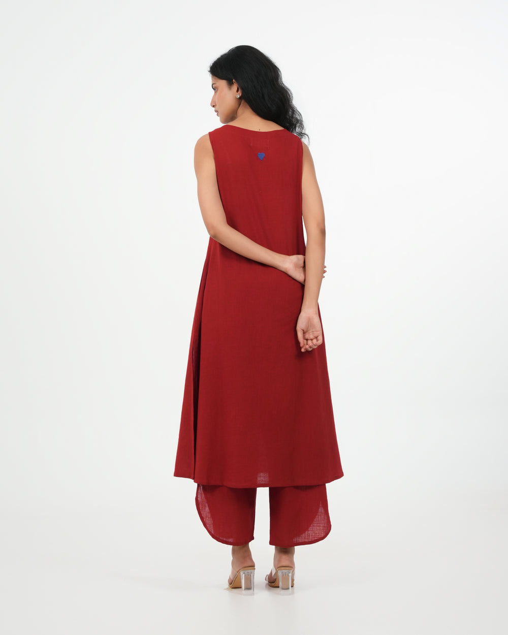 This maroon cotton sleeveless kurta (plant-based dye) and a blue polka dot dupatta in handloom mulmul cotton fabric with hand block Bagru print—an ideal combo for casual sophistication.