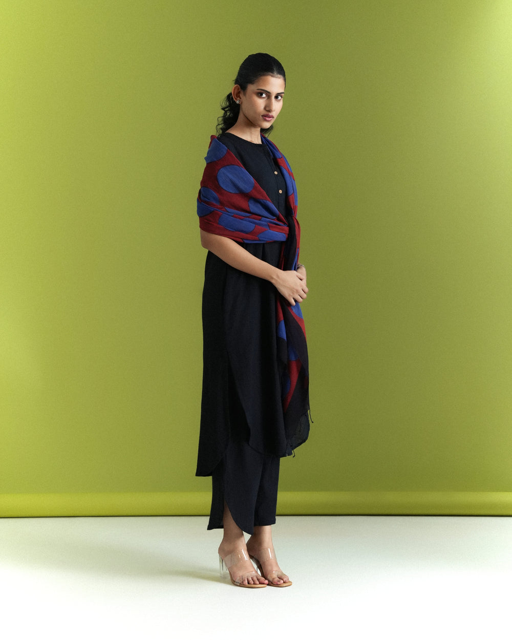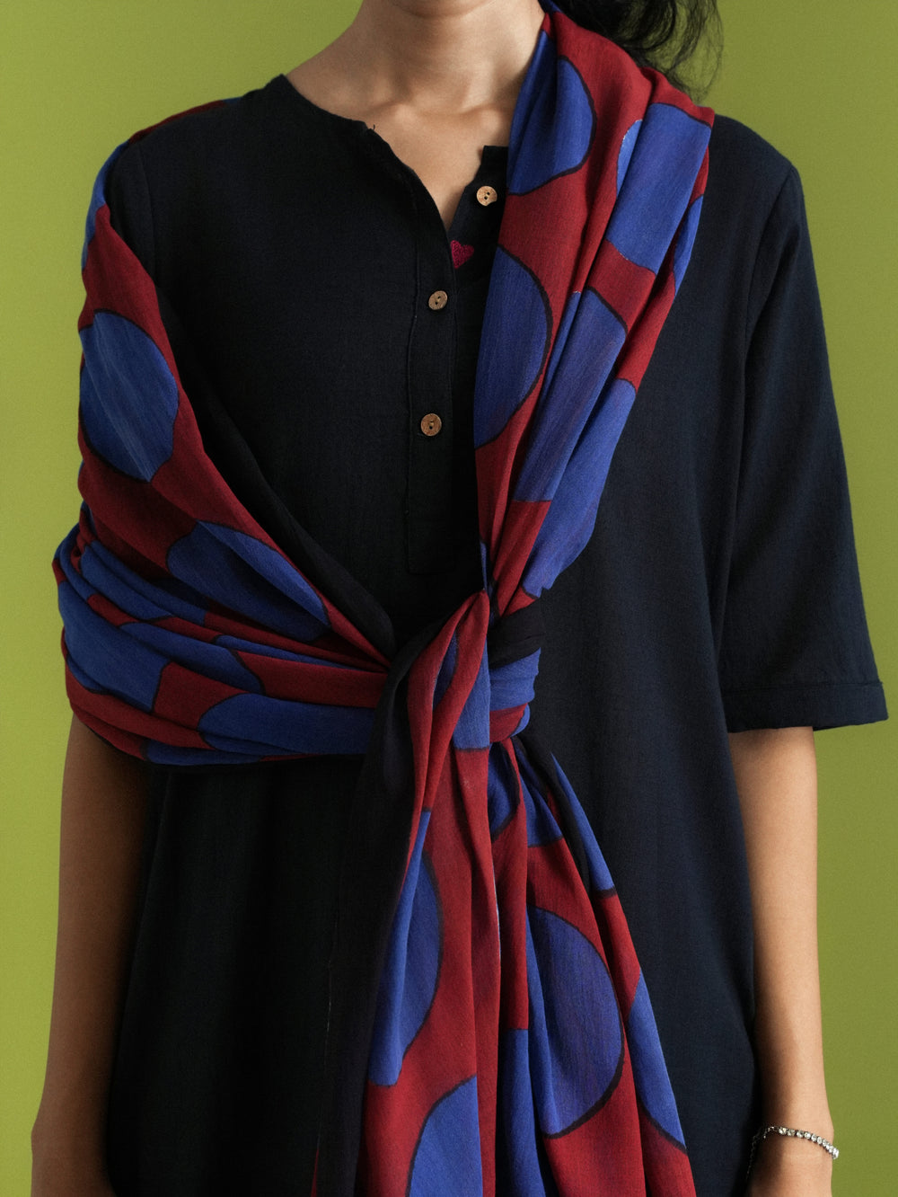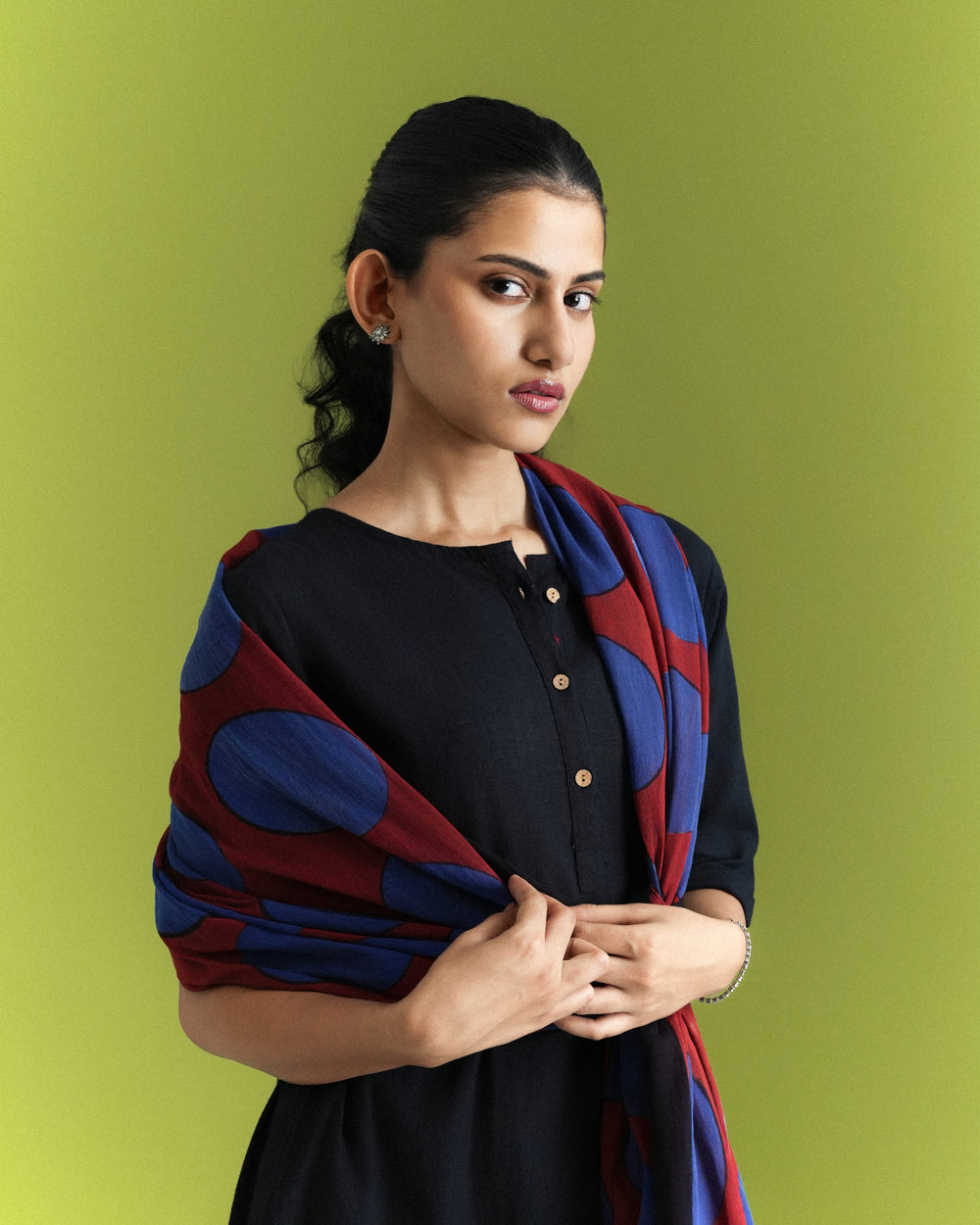 A versatile black cotton kurta with 3/4 sleeves and a maroon/blue polka dupatta in handloom mulmul cotton fabric with hand block Bagru print. Plant-based dye and front-open comfort make it a go-to.