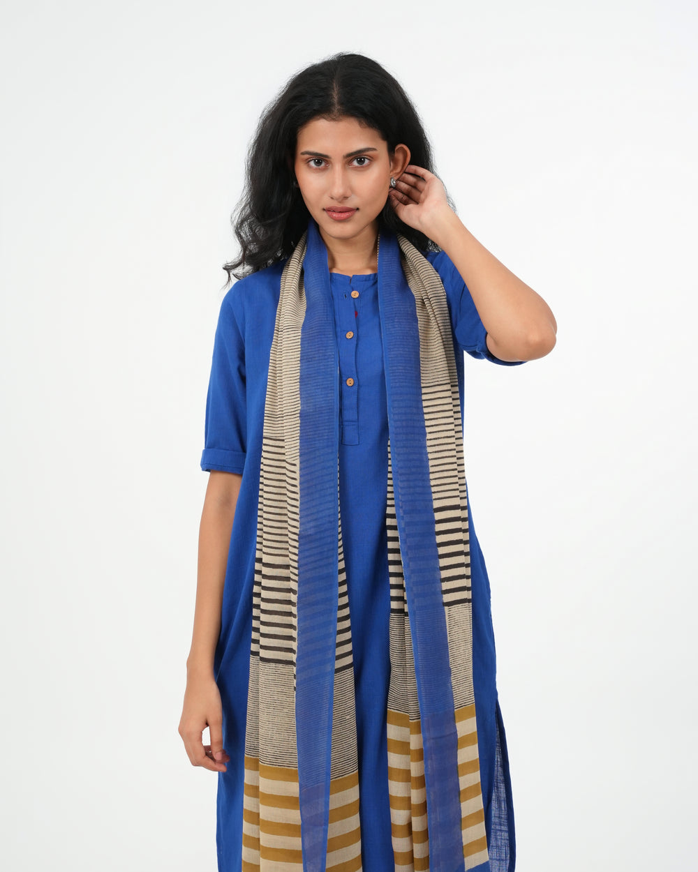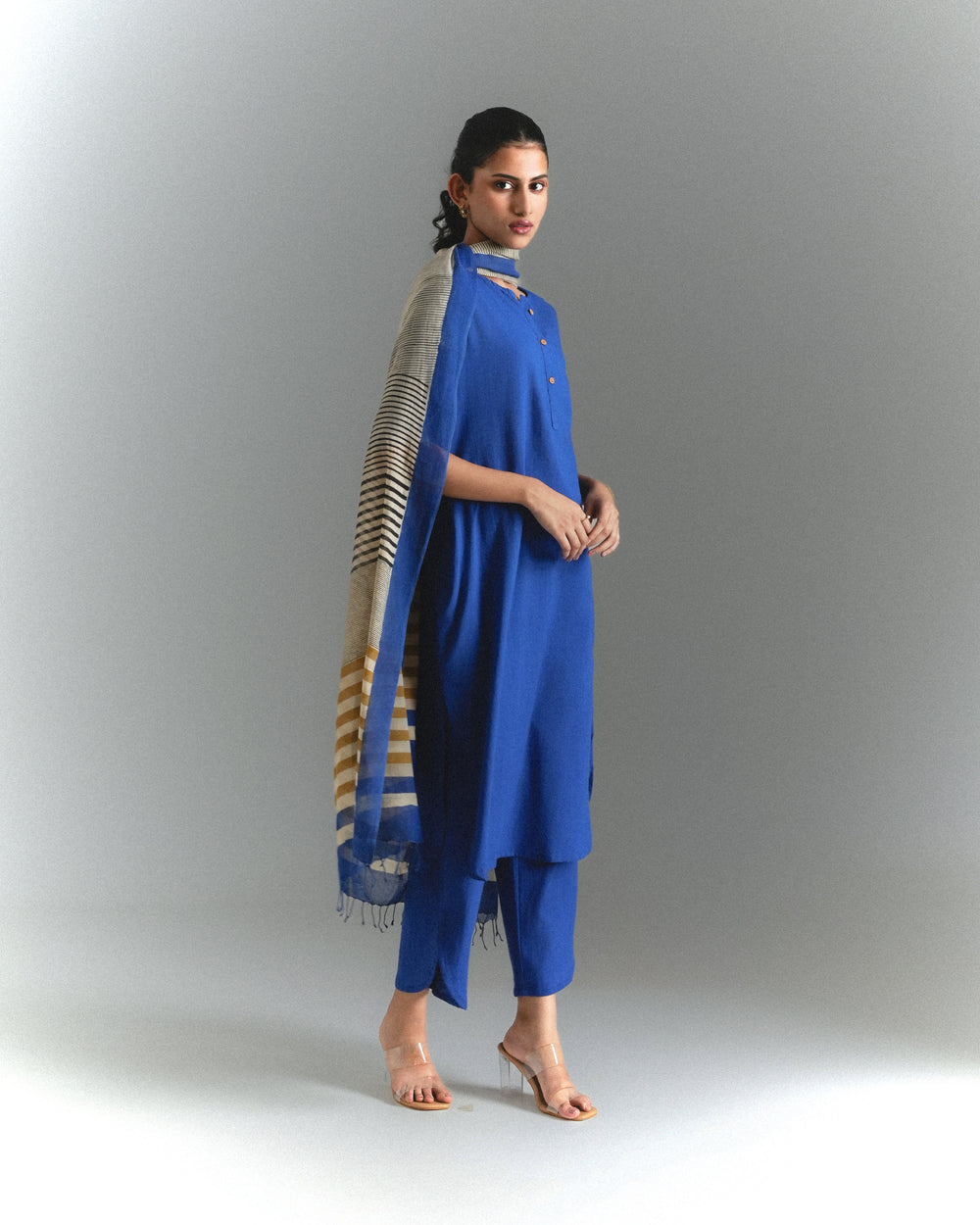 Dyed with plant-based royal blue, this cotton kurta features a round neck, 3/4 sleeves, and side pockets. Comes with your choice of maroon polka, blue-white stripes, or mustard stripe dupatta in handloom mulmul cotton fabric with hand block Bagru print.